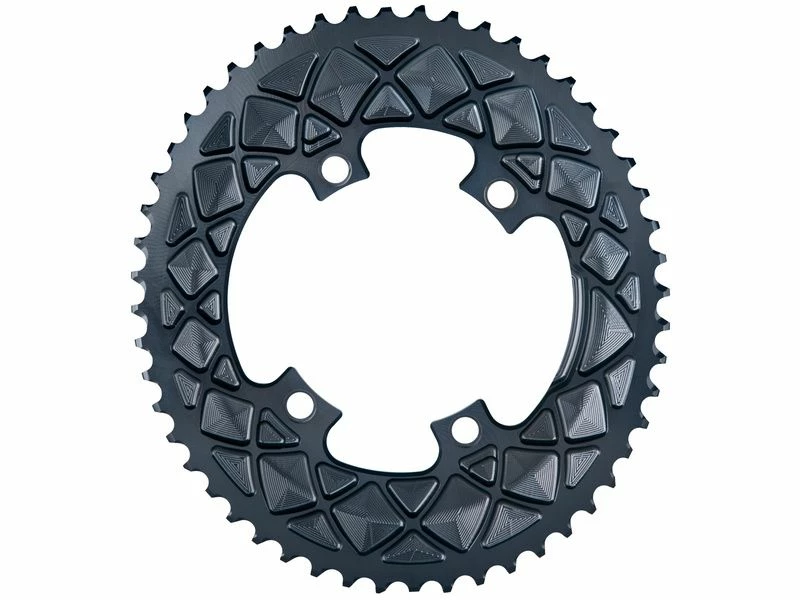 Développé pour les transmissions route 2X, le plateau ovale Absolute Black est ici compatible avec les pédaliers 4 trous 110 mm (Shimano Dura-Ace 9000, Ultegra 6800, Shimano 105 5800, Tiagra 4700 et bien d’autres encore) Son usinage de grande qualité offre un passage de vitesse souple et précis. Il est compatible avec les capteurs de puissances DI2, Pioneer et SRM