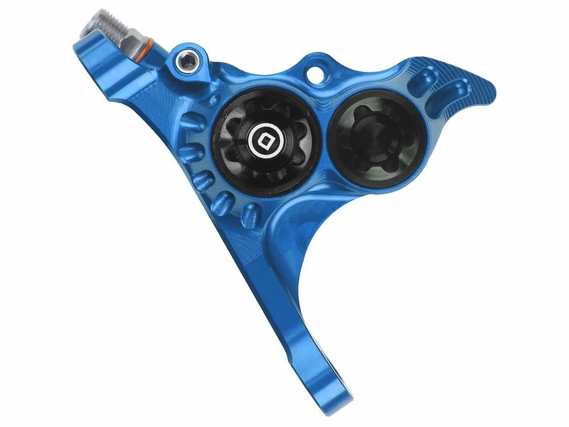 L‘étrier de frein Hope RX4+ est usiné à partir d’un bloc en aluminium 2014 T6 offrant une grande rigidité et un touché de freinage franc. Equipé de 4 pistons en résine phénolique (2 pistons de 14 mm et 2 pistons de 16 mm) ils sont ici développés pour fonctionner avec les freins à disque utilisant de l’huile DOT (Sram). L’étrier RX4+ est disponible en 6 couleurs d’anodisation (Bleu, Orange, Rouge, Noir, Violet, Argent) et est livré avec deux types de plaquettes (Bleues pour un usage route, et Rouges pour un usage Cyclo Cross / Gravel) .