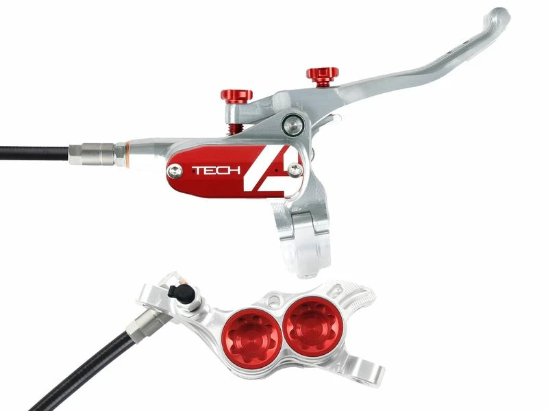 Son maitre cylindre est maintenant équipé de pivot levier monté sur roulements à billes et de nouveaux joints internes réduisant les frictions. L’augmentation de la démultiplication du levier d’environ 30% offre un meilleur feeling et une plus grande puissance tout en réduisant la fatique musculaire. La fixation du maitre cylindre du Tech 4 sur le guidon se fait par un système de collier à charnière très facile d’installation et compatible avec la fixation directe des commandes Shimano ISPEC EV et SRAM Matchmaker en utilisant des adaptateur vendus séparément. Toujours d’actualité, les vis BPC et Reach Adjust permettent d’ajuster la garde du levier et le contact plaquettes sans outil .