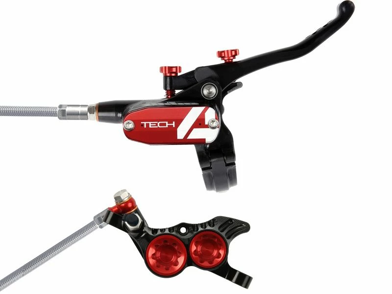 Son maitre cylindre est maintenant équipé de pivot levier monté sur roulements à billes et de nouveaux joints internes réduisant les frictions. L’augmentation de la démultiplication du levier d’environ 30% offre un meilleur feeling et une plus grande puissance tout en réduisant la fatique musculaire. La fixation du maitre cylindre du Tech 4 sur le guidon se fait par un système de collier à charnière très facile d’installation et compatible avec la fixation directe des commandes Shimano ISPEC EV et SRAM Matchmaker en utilisant des adaptateur vendus séparément. Toujours d’actualité, les vis BPC et Reach Adjust permettent d’ajuster la garde du levier et le contact plaquettes sans outil .