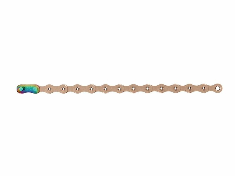 La chaine PC XX1 Eagle de Sram dispose d’une toute nouvelle conception basée sur la technologie FlowLink. Les maillons n’ont plus d’angle saillant ni de chanfrein pour obtenir des plaques plus plates. Ainsi le rivetage est plus solide, plus précise, plus silencieuse et plus durable. Elle est reconnaissable grâce à ses 4 finitions spécifiques noire, or, rainbow et cuivre et est livrée avec une attache rapide PowerLock 12 vitesses non réutilisable en forme de banane.